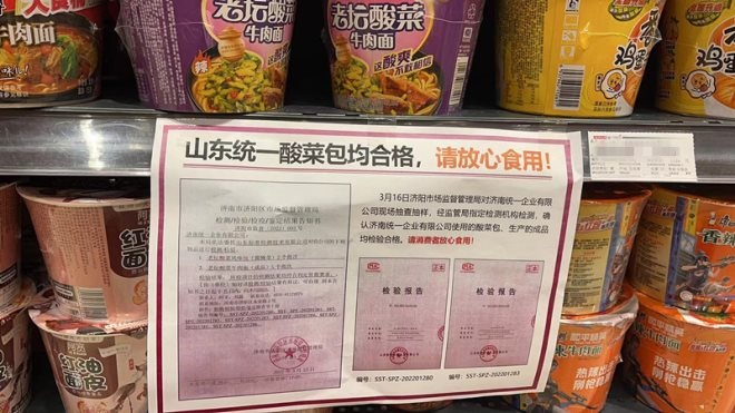 多家超市企業(yè)也向《聯(lián)商網(wǎng)》表示,315曝光后立即下架了“老壇酸菜”方便面,現(xiàn)在質檢合格后,才重新上架,并在貨架旁張貼了質檢報告和說明函。