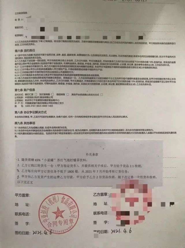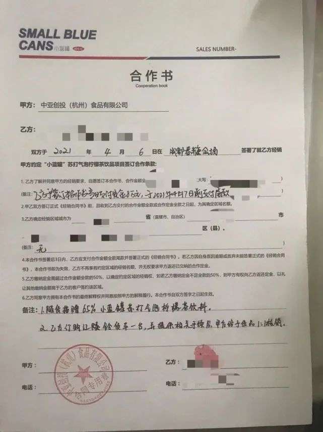 在2021年成都糖酒會上,四川人鐘明同樣被“娃哈哈”醒目的logo吸引。為了證實產(chǎn)品的真實性,鐘明還當(dāng)場打通了娃哈哈客服的電話!爱(dāng)時對方說小藍(lán)罐是他們紅安工廠生產(chǎn)的,不是貼牌的,中亞創(chuàng)投又說他們是娃哈哈的子公司,所以我很放心。”鐘明現(xiàn)場簽下意向合同書,并支付了1萬元定金。