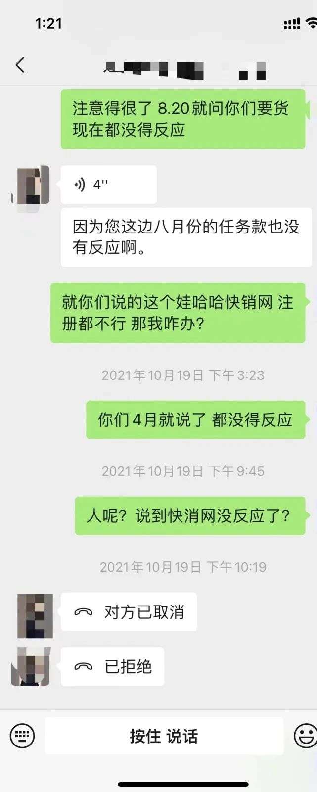 鐘明的銷售情況也不樂觀,收到的1000件貨只賣了400件。并且,他多次追問中亞創(chuàng)投工作人員開通快銷網(wǎng)情況,都被一次次拖延!拔液髞泶螂娫捊o快銷網(wǎng),對方說我并非娃哈哈經(jīng)銷商,無法進(jìn)入快銷網(wǎng)平臺”。