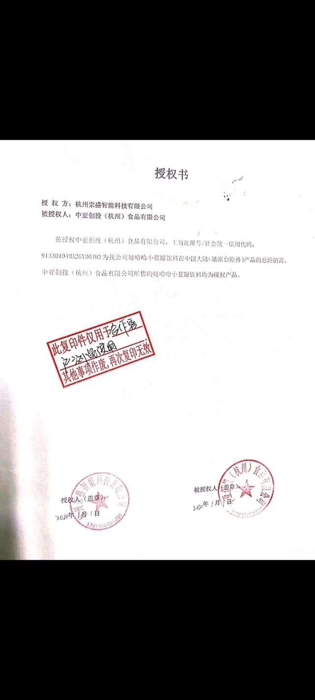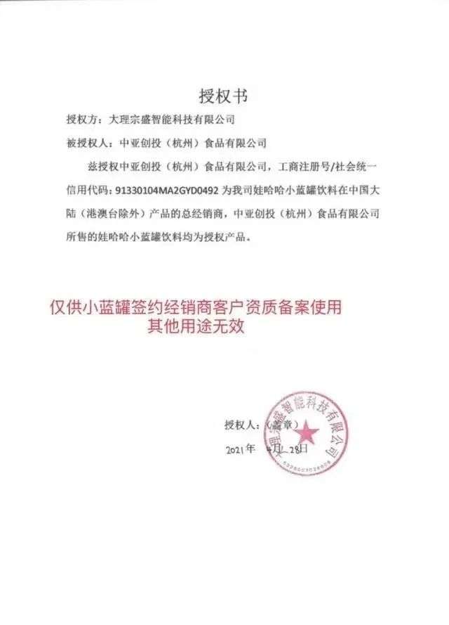 而中亞創(chuàng)投為大理宗盛授權(quán)的娃哈哈小藍(lán)罐在中國大陸的總經(jīng)銷商。經(jīng)銷商提供給時代財經(jīng)的授權(quán)書有兩份,簽訂日期分別為2020年1月1日和2021年4月28日,均無標(biāo)注授權(quán)有效期。