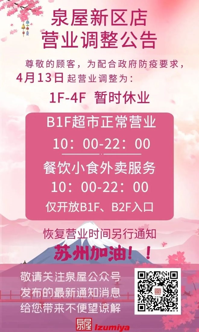 1、泉屋新區(qū)店:自4月13日起暫停營業(yè),保留B1超市及餐飲外賣服務(wù)。外賣營業(yè)時(shí)間10:00-22:00。