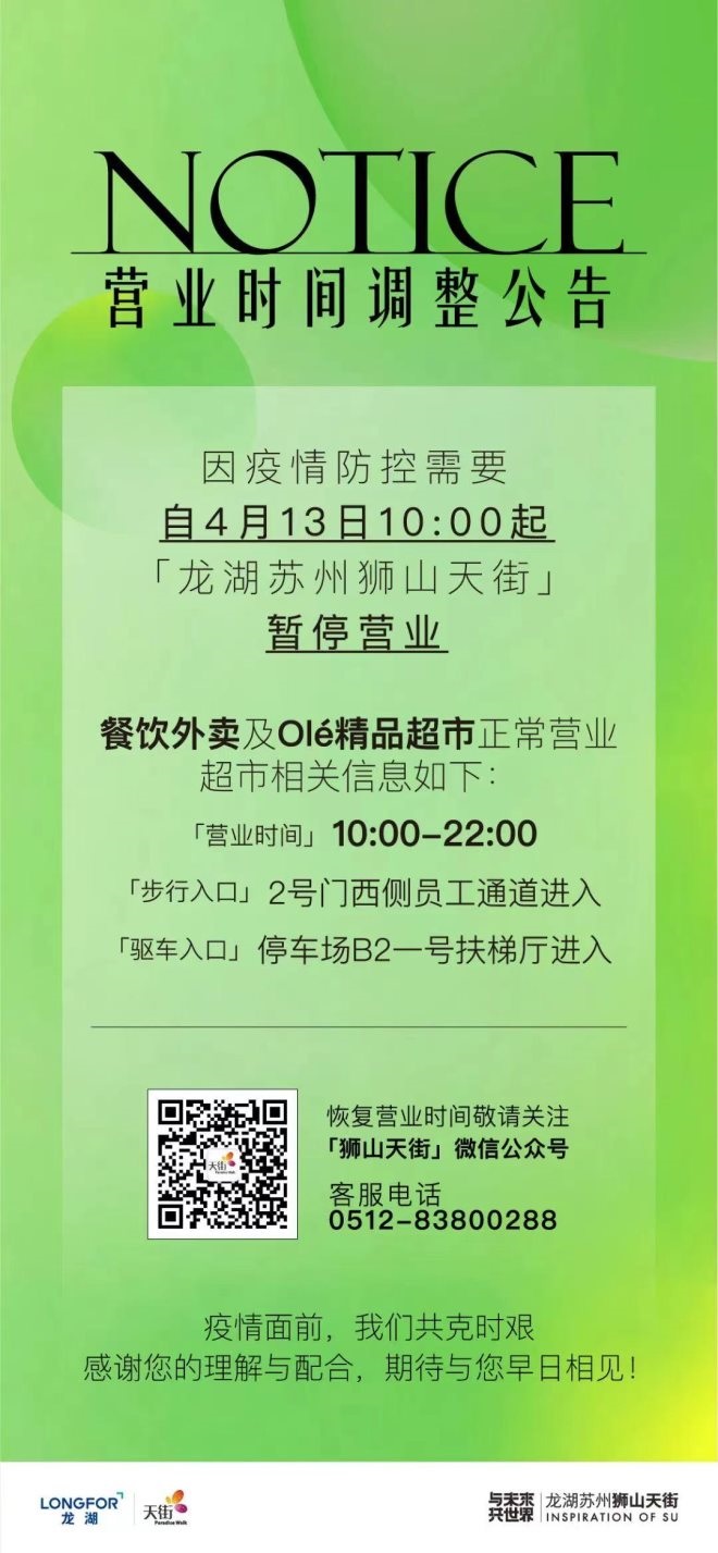 2、龍湖蘇州獅山天街:自4月13日10點(diǎn)起暫停營業(yè),保留超市及餐飲外賣服務(wù)。外賣營業(yè)時(shí)間10:00-22:00。