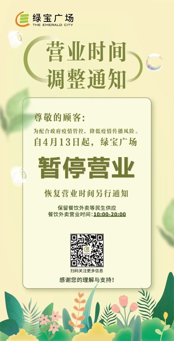 3、綠寶廣場:自4月13日起暫停營業(yè),保留餐飲外賣等民生供應(yīng)。外賣營業(yè)時(shí)間10:00-20:00。