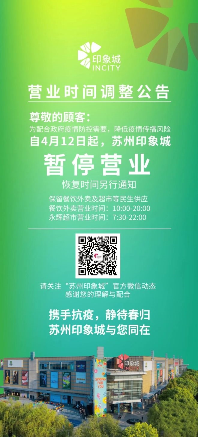 4、蘇州印象城:自4月12日起暫停營業(yè),恢復(fù)時(shí)間另行通知。保留餐飲外賣及超市等民生供應(yīng)。