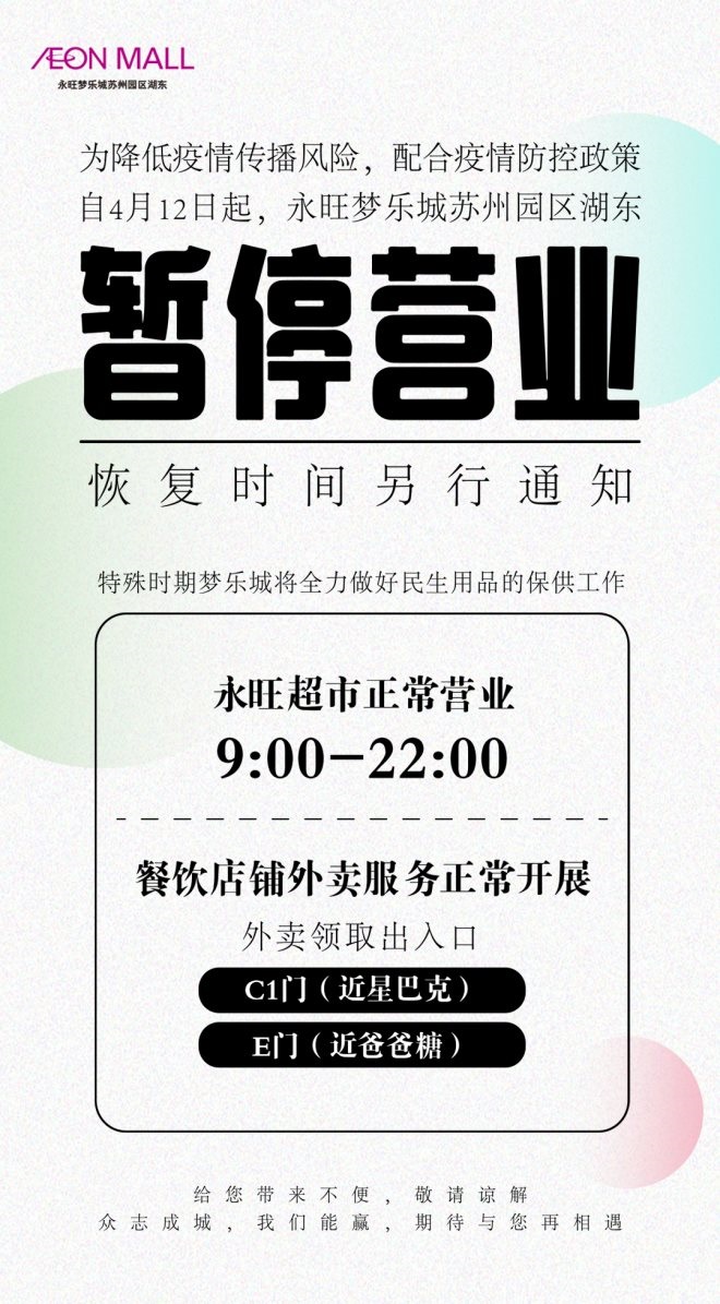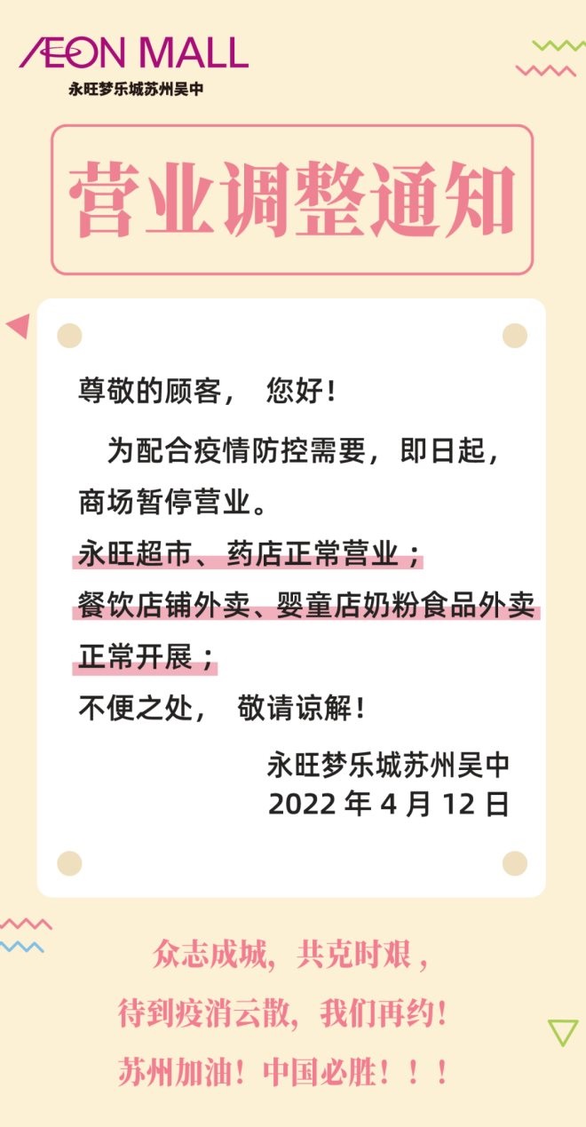 5、永旺夢樂城蘇州園區(qū):自4月12日起暫停營業(yè),恢復(fù)時(shí)間另行通知。保留餐飲外賣及超市等正常營業(yè)。永旺超市營業(yè)時(shí)間:9:00-22:00。