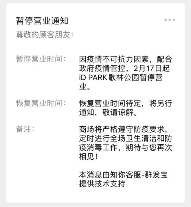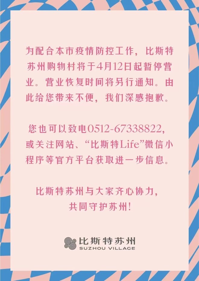 6、比斯特購物村:自4月12日起暫停營業(yè),恢復(fù)時(shí)間另行通知。