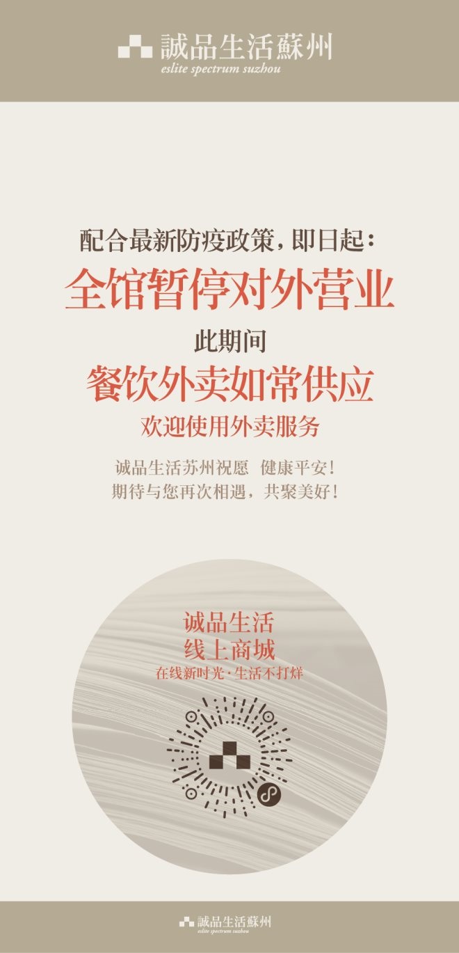 7、誠品生活蘇州:自4月12日起暫停營業(yè),恢復(fù)時(shí)間另行通知。保留餐飲外賣如常供應(yīng)。