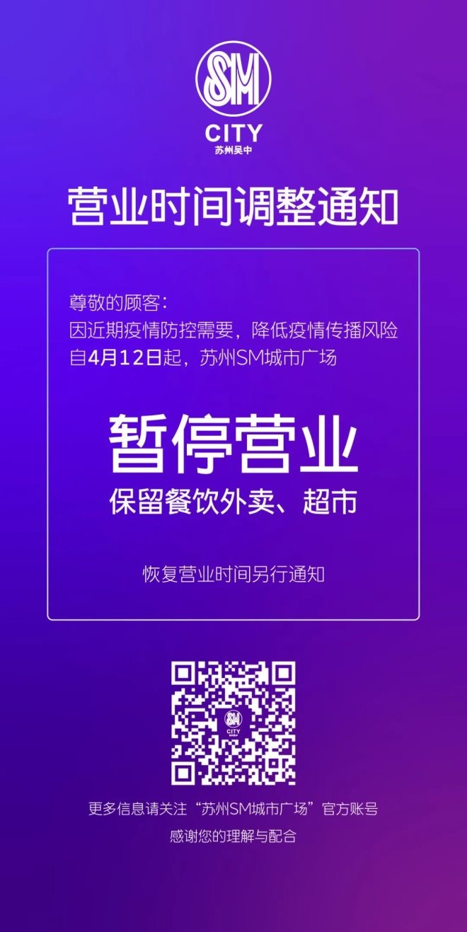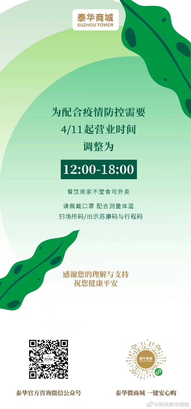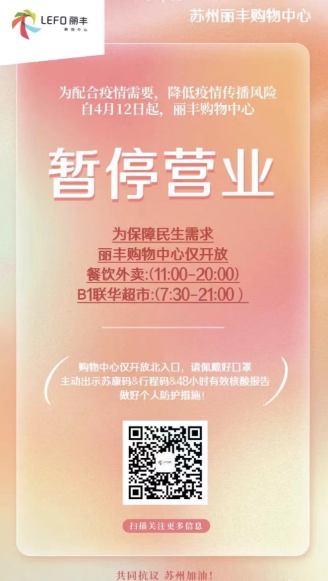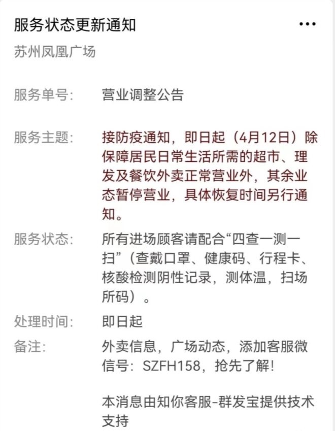 9、蘇州鳳凰廣場:自4月12日起暫停營業(yè),保留餐飲外賣及超市、理發(fā)等正常營業(yè),具體恢復(fù)時(shí)間另行通知。