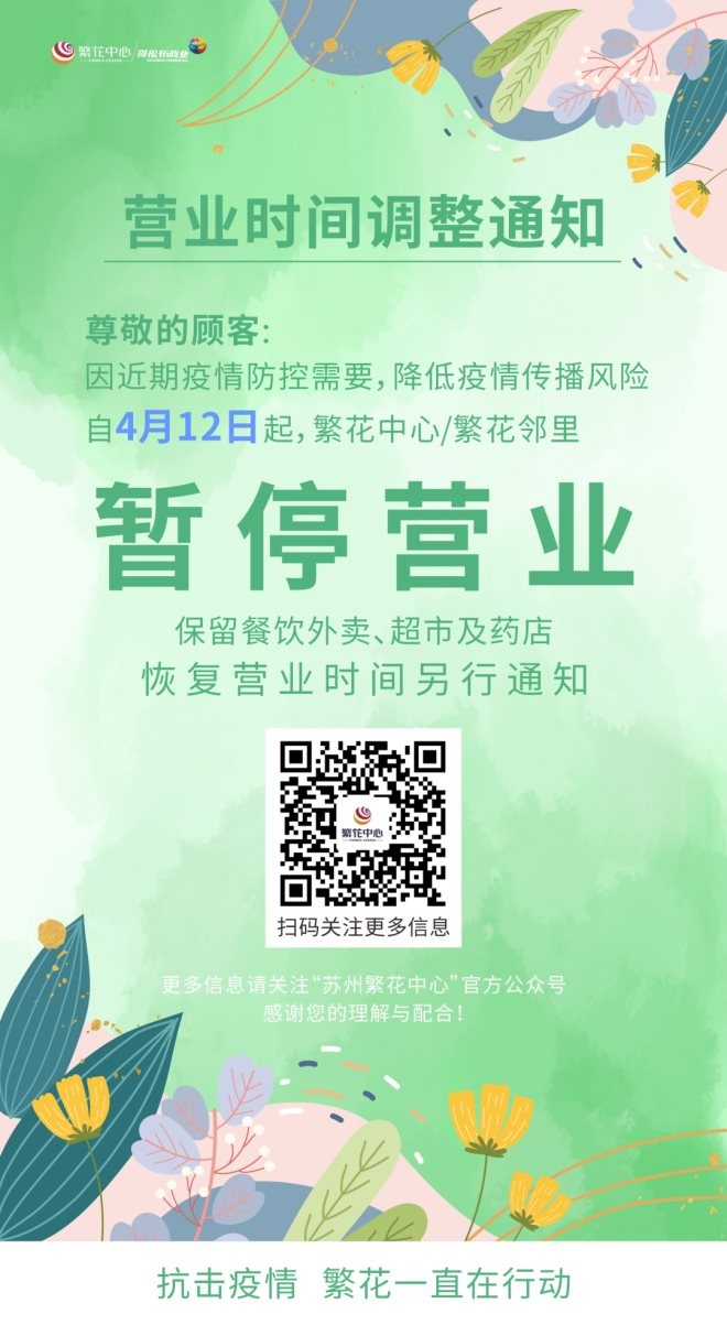 10、相城繁花中心:自4月12日起暫停營業(yè),僅保留餐飲外賣、超市及藥店;謴(fù)時(shí)間另行通知。