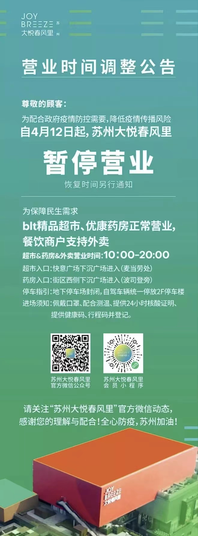 11、蘇州大悅春風(fēng)里:自4月12日起暫停營業(yè),保留blt精品超市、餐飲外賣及藥房。外賣營業(yè)時(shí)間10:00-20:00。