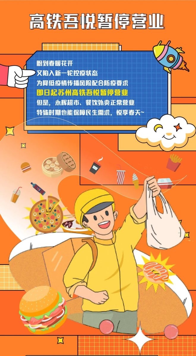 12、蘇州高鐵吾悅廣場:自4月12日起暫停營業(yè),保留超市、餐飲外賣及藥店。永輝超市營業(yè)時(shí)間7:30-22:00。