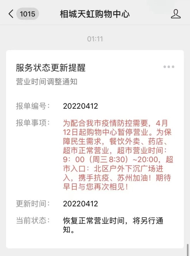 根據(jù)疫情發(fā)展現(xiàn)狀,蘇州動態(tài)調(diào)整升級管控措施,部分商場調(diào)整營業(yè)時(shí)間,大部分商場從4月12日開始暫停營業(yè),僅保留超市及外賣餐飲服務(wù),具體恢復(fù)正常營業(yè)時(shí)間未知。