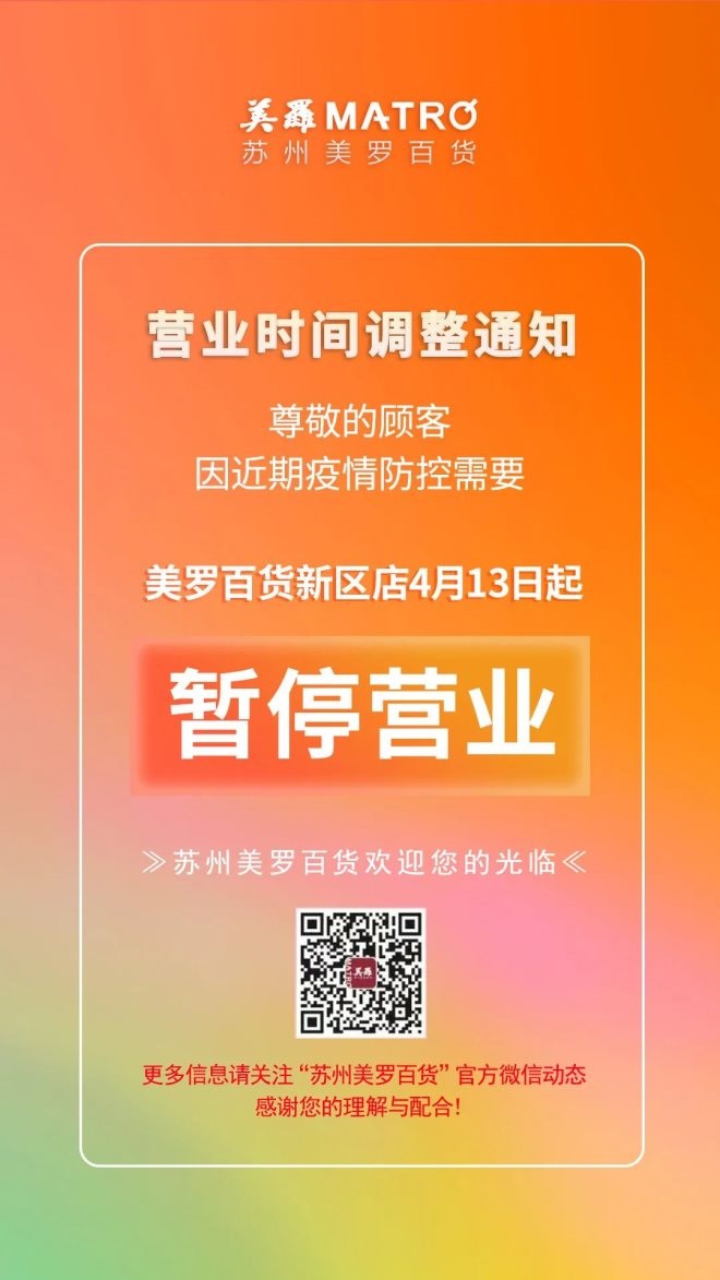 15、蘇州美羅百貨觀前店:自4月12日起暫停營業(yè)一周。