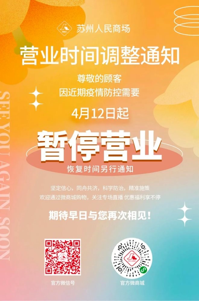 18、蘇州人民商場:自4月12日起暫停營業(yè),恢復(fù)時(shí)間另行通知。