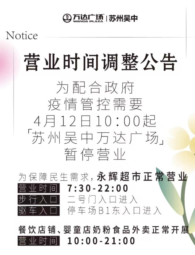 21、吳中萬達(dá)廣場:自4月12日10:00起暫停營業(yè),保留餐飲外賣及永輝超市。餐飲外賣營業(yè)時(shí)間10:00-21:00,永輝超市7:30-22:00。