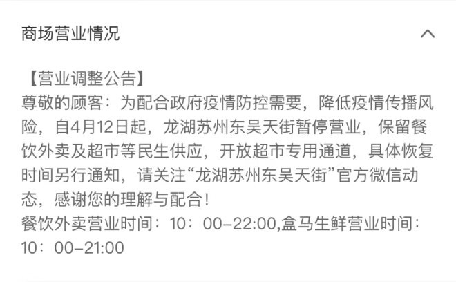 22、龍湖蘇州東吳天街:自4月12日起暫停營業(yè),保留餐飲外賣及超市。餐飲外賣營業(yè)時(shí)間10:00-22:00,盒馬鮮生營業(yè)時(shí)間10:00-21:00。