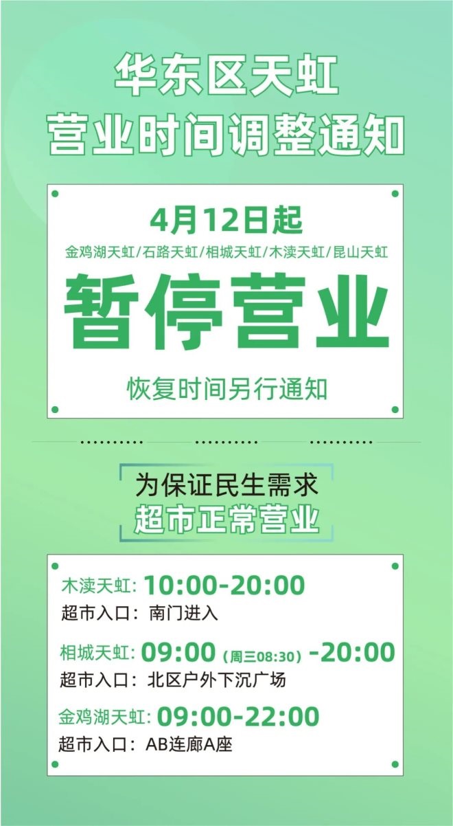 13、相城天虹:自4月12日起暫停營業(yè),保留超市、餐飲外賣及藥店。超市營業(yè)時(shí)間9:00(周三8:30)-20:00。