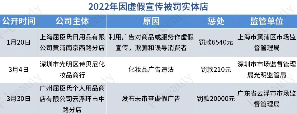 《未來跡Future Beauty》經(jīng)過整理發(fā)現(xiàn),2022年才過了一個(gè)季度,全國已經(jīng)有35家化妝品實(shí)體零售店接到了處罰通知,其中不乏全國知名的大連鎖,屈臣氏更是三個(gè)月內(nèi)連吃三張罰單。這35家化妝品店一季度共計(jì)被罰款超過124萬元。更重要的是,這些門店在市場監(jiān)督管理局留了“案例”,并被全網(wǎng)公開,對商譽(yù)是個(gè)不小的影響。