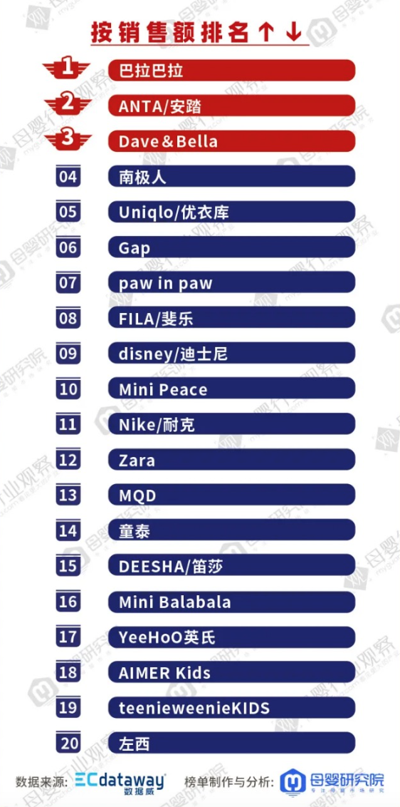 由數(shù)據(jù)威整理的2021天貓618童裝終極榜單顯示,2021年6月1日至6月20日,天貓童裝銷售額TOP10分別是巴拉巴拉、安踏、Dave&Bella、南極人、優(yōu)衣庫、Gap、paw in paw、斐樂、迪士尼、Mini Peace。