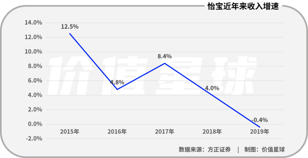 在動(dòng)輒百億營收的飲料企業(yè)面前,華潤怡寶的表現(xiàn)并不亮眼。2017年-2019年(華潤怡寶在2019年后未公布業(yè)績),華潤怡寶的總營業(yè)收入為100.35億元、104.35億元和103.96億元。雖然營收略有增長,但是增速卻逐年下滑,2019年收入增速為-0.4%。