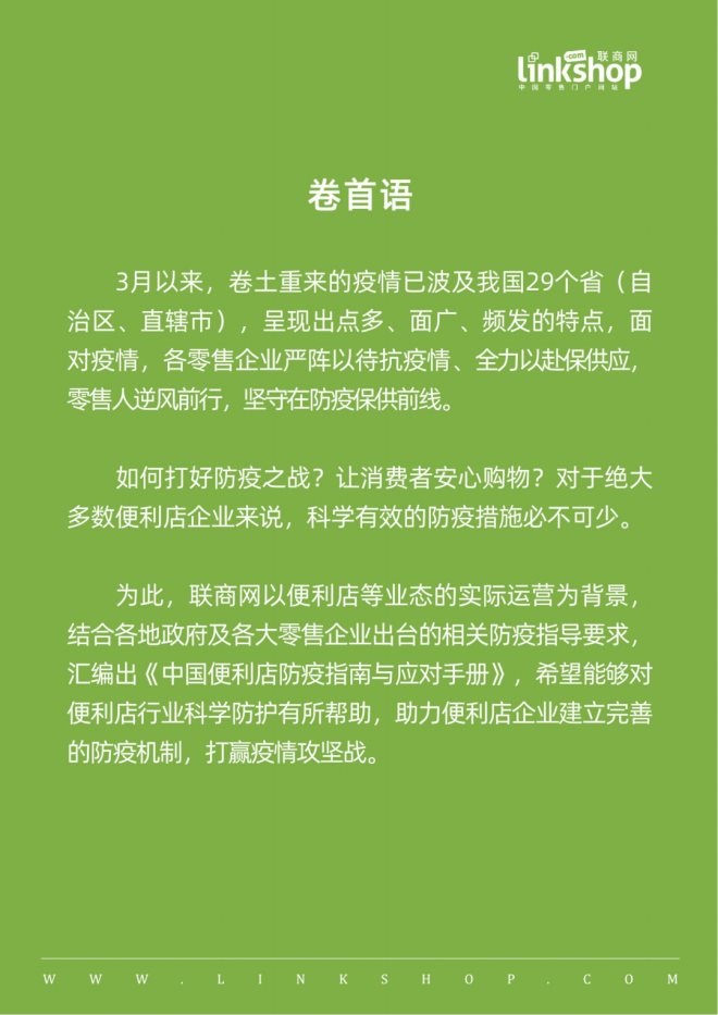 本手冊從防疫工作組織保障到政府部門的對接,共分為七章,總共2萬余字,是便利店行業(yè)首部相對完善的防疫指南與應(yīng)對手冊。