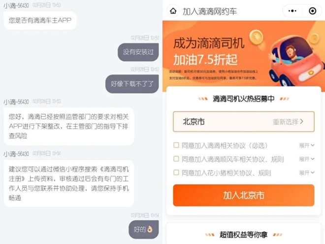 2月28日,燃財(cái)經(jīng)曾向滴滴客服咨詢新司機(jī)注冊(cè)問(wèn)題,在沒有下載過(guò)“滴滴車主”APP的前提下,客服表示,可以“通過(guò)微信小程序搜索《滴滴司機(jī)注冊(cè)》上傳資料,審核通過(guò)后會(huì)有專門的工作人員與您聯(lián)系并協(xié)助處理”。當(dāng)日,燃財(cái)經(jīng)使用該小程序,也確實(shí)可以進(jìn)行提交資料等程序。