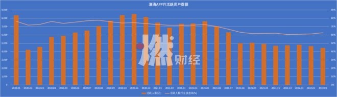 但滴滴也在“掉肉”。據(jù)易觀千帆數(shù)據(jù),2020年1月至2021年6月,滴滴月活躍人數(shù)的行業(yè)滲透率一直保持在70%以上,但自2021年7月審查開始之后便一路下跌,到2022年3月,行業(yè)滲透率為62.66%。