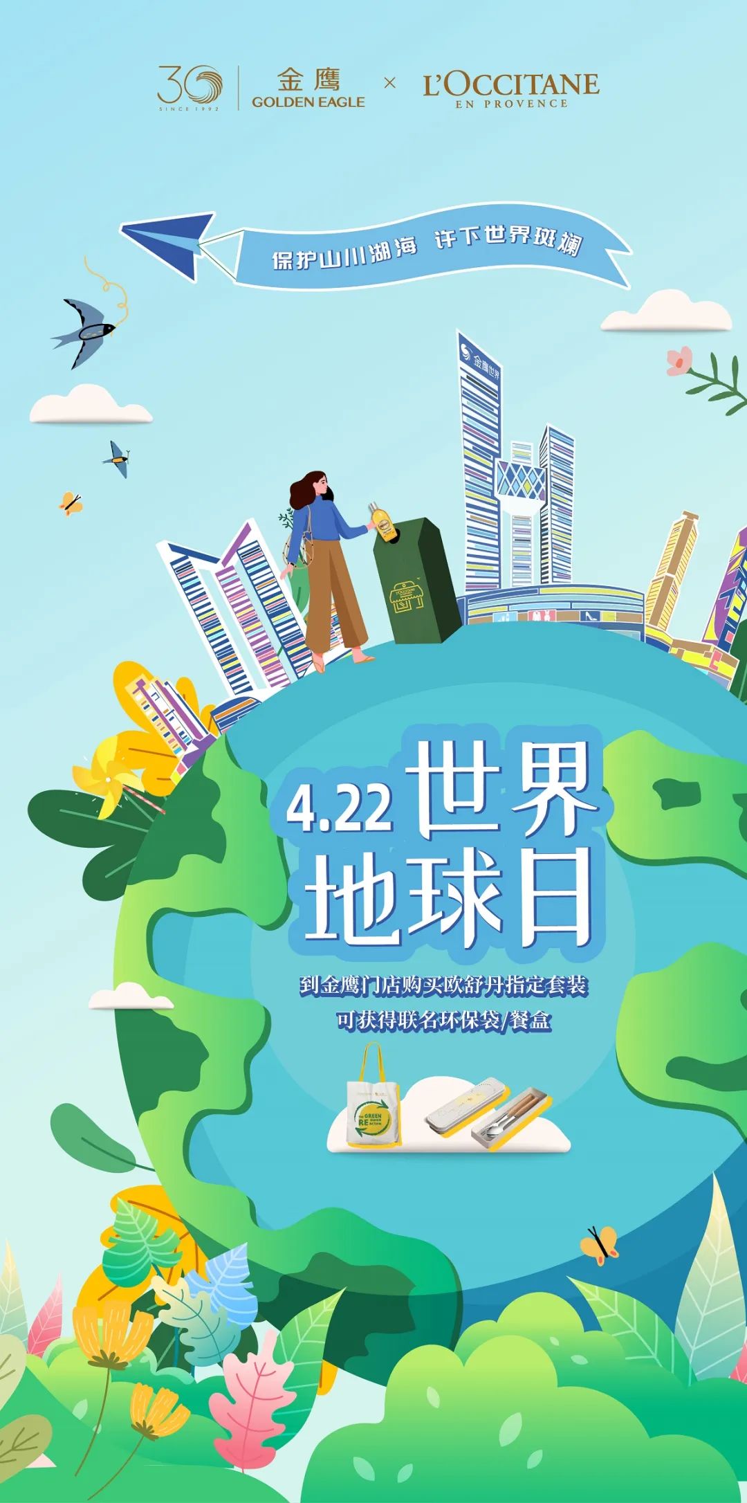 盎然春意,浪漫隨行。金鷹集團30周年聯(lián)合歐舒丹,續(xù)寫綠色環(huán)保新篇章,為消費者帶來春日驚喜禮遇。凡購買歐舒丹活動商品或購物滿享,即可獲得環(huán)保材料特制的精美禮品。