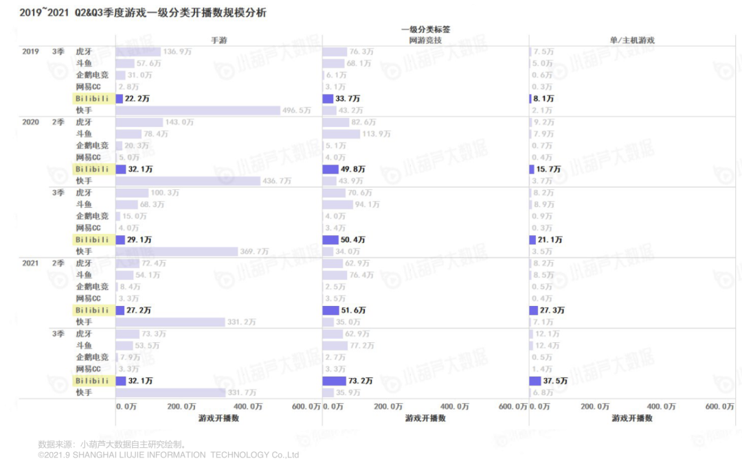 不過,游戲直播對(duì)B站整個(gè)直播業(yè)務(wù)的拉動(dòng)效果也有限。最典型的例子是,2019年12月,B站高價(jià)邀請(qǐng)“斗魚一姐”馮提莫入駐,今年是其與B站簽約的第三年,目前在主播的熱門總榜中排名50名開外。根據(jù)小葫蘆大數(shù)據(jù),近年B站在游戲一級(jí)分類開播數(shù)量,遠(yuǎn)低于斗魚、虎牙、快手。