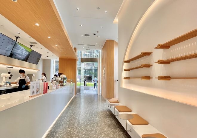 店內(nèi)圓弧玻璃房設(shè)計(jì)通透明亮,整體裝修以簡(jiǎn)單大氣的白色為主色調(diào),再融入散發(fā)自然氣息的原木家具。