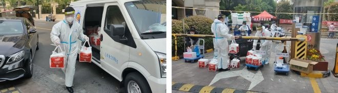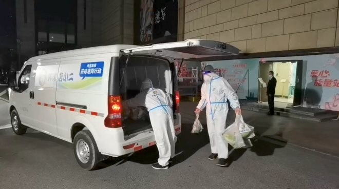 “環(huán)球店小二”在晚間為社區(qū)配送物資。