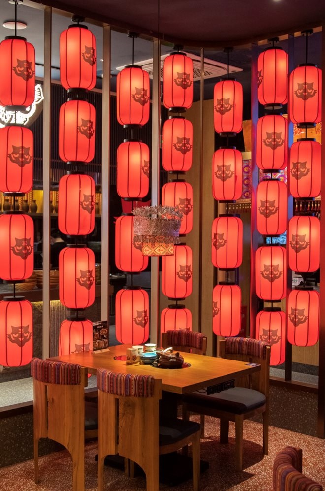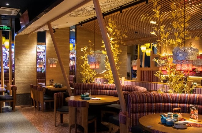 門店裝修以中國風(fēng)為設(shè)計靈感,融合中西元素,一般使用紅藍(lán)經(jīng)典配色,配合現(xiàn)代風(fēng)細(xì)節(jié)修飾,門口安裝搶眼的霓虹燈牌,古今新舊交織匯聚。