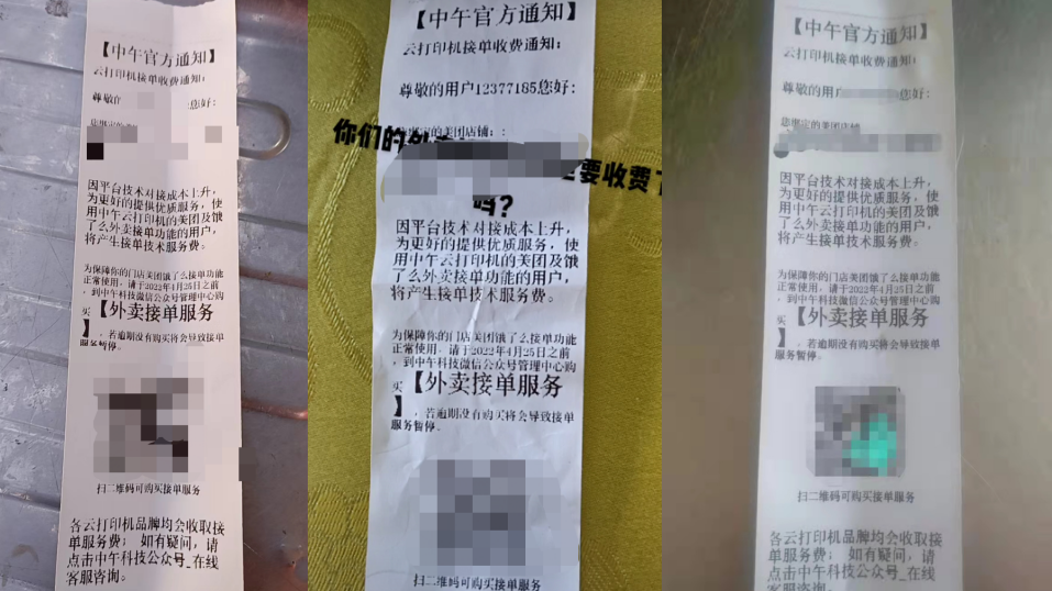 之前,餐飲商家外賣打印訂單是不收費的,但今年來,不少商家陸續(xù)收到打印機廠商的收費通知。