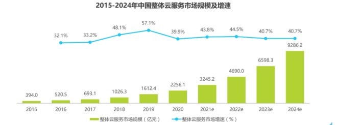 根據(jù)艾瑞咨詢發(fā)布的《2021年中國基礎(chǔ)云服務(wù)行業(yè)數(shù)據(jù)報(bào)告》,2024年,中國整體云(包括公有云、私有云和混合云)服務(wù)市場規(guī)模將突破9000億元,且保持超過40%的增速。