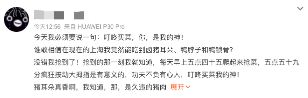 “叮咚買菜還是比其他的給力點(diǎn)”、“叮咚買菜真的救我,菜多實(shí)惠!”一方面,網(wǎng)友好評(píng)在微博等社交平臺(tái)上屢見不鮮,另一方面,搶不到菜的網(wǎng)友們?nèi)耘f寄希望于叮咚補(bǔ)貨。
