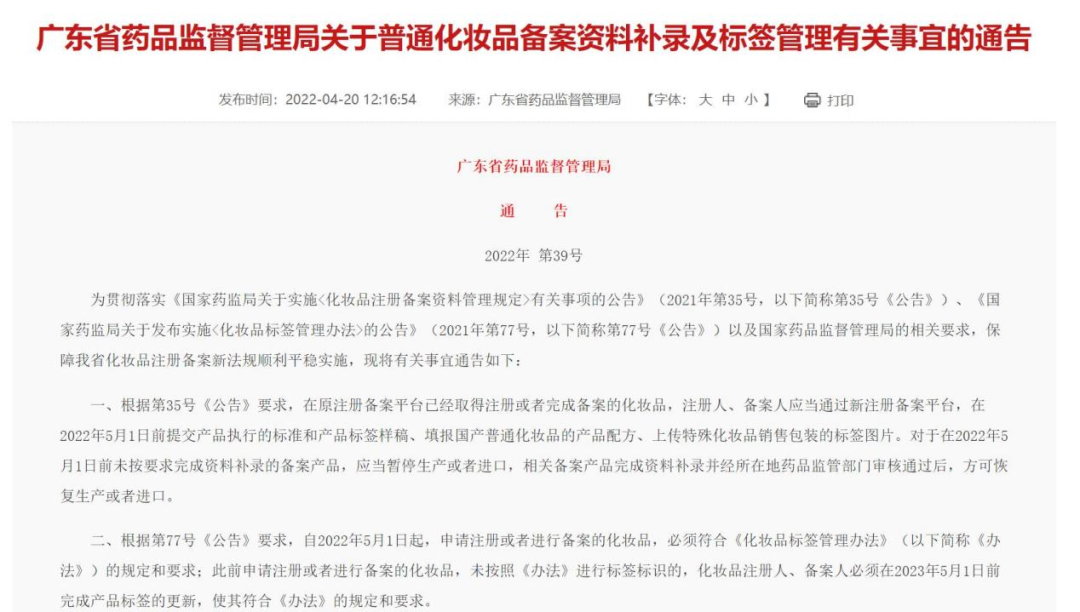 廣東藥監(jiān)局:對于在2022年5月1日前未按要求完成資料補錄的備案產(chǎn)品,應當暫停生產(chǎn)或者進口,相關(guān)備案產(chǎn)品完成資料補錄并經(jīng)所在地藥品監(jiān)管部門審核通過后,方可恢復生產(chǎn)或者進口。