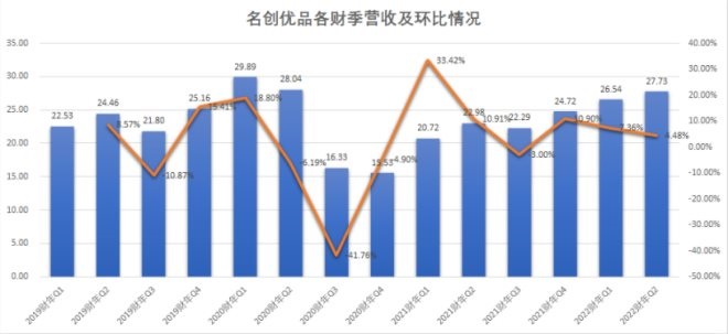 可以看到,經(jīng)歷了2020財(cái)年Q3-Q4(對(duì)應(yīng)時(shí)間點(diǎn)為2020年1月-6月疫情期間)的營收大滑坡之后,名創(chuàng)優(yōu)品在這兩年間開始逐漸緩過氣來,大體上處于一個(gè)增長勢態(tài)。