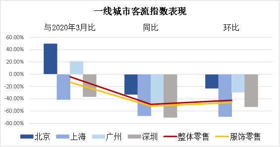 3月線(xiàn)下整體零售客流指數(shù)同比下降49.1%