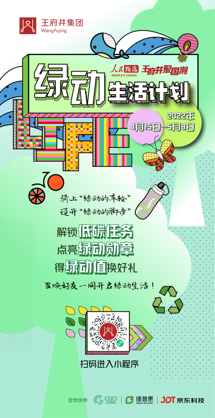 4月15日,由王府井集團發(fā)起,聯(lián)合人民創(chuàng)意、中華環(huán)保聯(lián)合會、綠普惠、京東科技等品牌機構共同參與,活動通過文化、環(huán)保、科技、消費等領域的強強聯(lián)合,開啟“向綠”模式,以“運動不止賽場 隨時綠動生活”為slogan,以“人民甄選·王府井聚國潮【綠動生活計劃】”為主題,在王府井集團全國35個城市的74家門店同步開啟,以實際行動踐行綠色發(fā)展理念,倡導綠色低碳健康生活,用低碳、健康的理念來引導品牌和消費者的行為,構建低碳共同體,讓綠色低碳成為經(jīng)濟高質量發(fā)展的亮麗底色。
