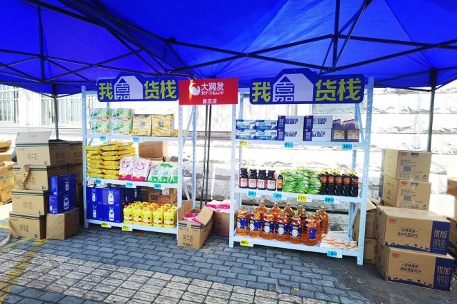 據(jù)媒體報道,4月17日起,在上海嘉定區(qū)金沙小區(qū)門口,大潤發(fā)開設(shè)了一家臨時超市。兩列貨架,米面糧油等30余種日常用品。讓封閉管理中的居民不出小區(qū)就能滿足基本生活采購需要。