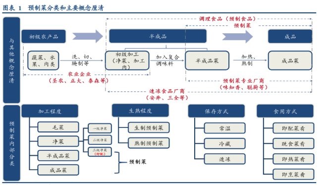 預(yù)制菜顧名思義是提前預(yù)制而成的菜品,但其實預(yù)制菜是一個很寬泛的概念。根據(jù)提前加工的復(fù)雜程度可以進(jìn)一步進(jìn)行分類。從經(jīng)過洗、切、腌制的酒店用即配菜,到開袋即食的成品菜,都可以算是預(yù)制菜。