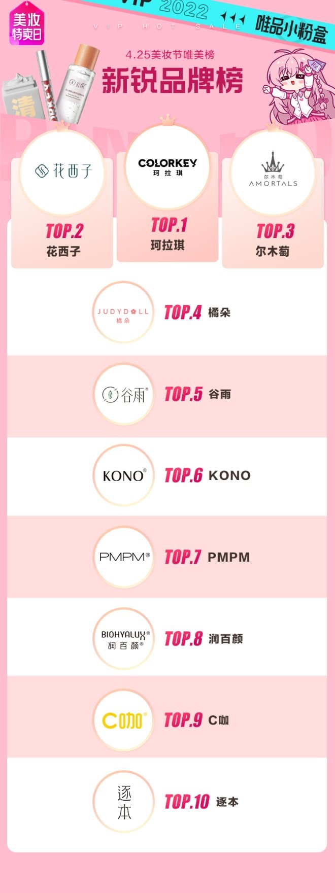 4月25日,唯品會發(fā)布《唯美榜——新銳品牌美妝榜》,此次評選聚焦平臺上近一年來廣受歡迎的新銳國產(chǎn)美妝,榜單結(jié)果是根據(jù)產(chǎn)品在平臺的銷量及增速、用戶反饋和買手推薦等多維度數(shù)據(jù)統(tǒng)計得出,上榜選手均為近年大熱的美妝國貨品牌。其中,珂拉琪、花西子、橘朵摘得此次《唯美榜》TOP3,榜首珂拉琪更是實現(xiàn)銷量同比增長超140%。