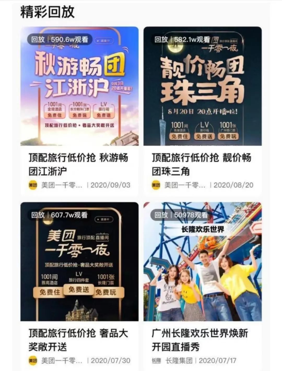 據(jù)了解,美團最早的一次直播在2020年4月21日進行,主題為KOL帶觀眾逛園林。美團“旅行直播”頻道的直播多為景區(qū)或者KOL介紹景點,數(shù)據(jù)基本為幾千至幾萬的觀看量。而該年7月30日美團進行了“一千零一夜”的直播,觀看量超過600萬。