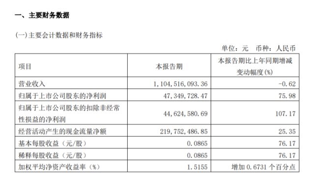 報(bào)告期內(nèi),三江購物實(shí)現(xiàn)營(yíng)收11.05億元,同比下降0.62%;歸屬上市公司股東的凈利潤(rùn)4734.97萬元,同比增長(zhǎng)75.98%;經(jīng)營(yíng)活動(dòng)產(chǎn)生的現(xiàn)金流量?jī)纛~為2.20億元,同比增長(zhǎng)25.35%;基本每股收益0.0865元。