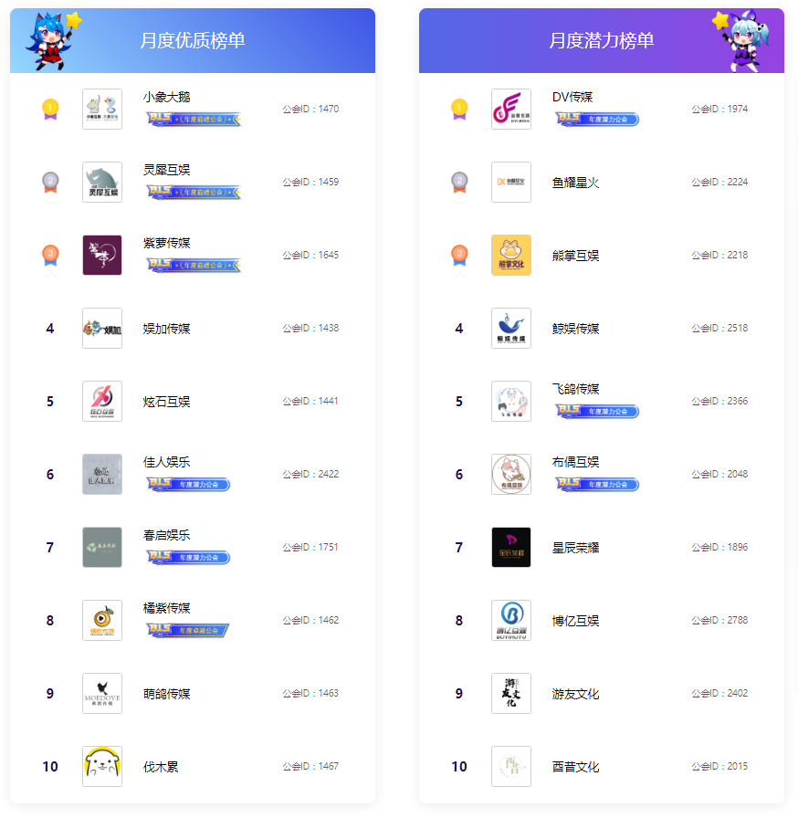 而在B站月度公會優(yōu)質(zhì)榜單中,小象大鵝位列第一,但對于在諸多直播平臺都入駐的大公會來說,小象大鵝對B站直播的重視程度并不高。