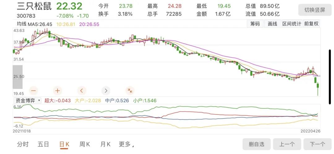 股市方面,和上市初期的股價一路高歌猛進,巔峰時股價91.09元/股,市值超360億元不同,財報發(fā)布前,三只松鼠股價報收29.27元/股,截至4月26日收盤,三只松鼠報22.32元,跌幅7.08%,盤中曾跌超20%,總市值僅89.5億元,不到巔峰時期的1/4。