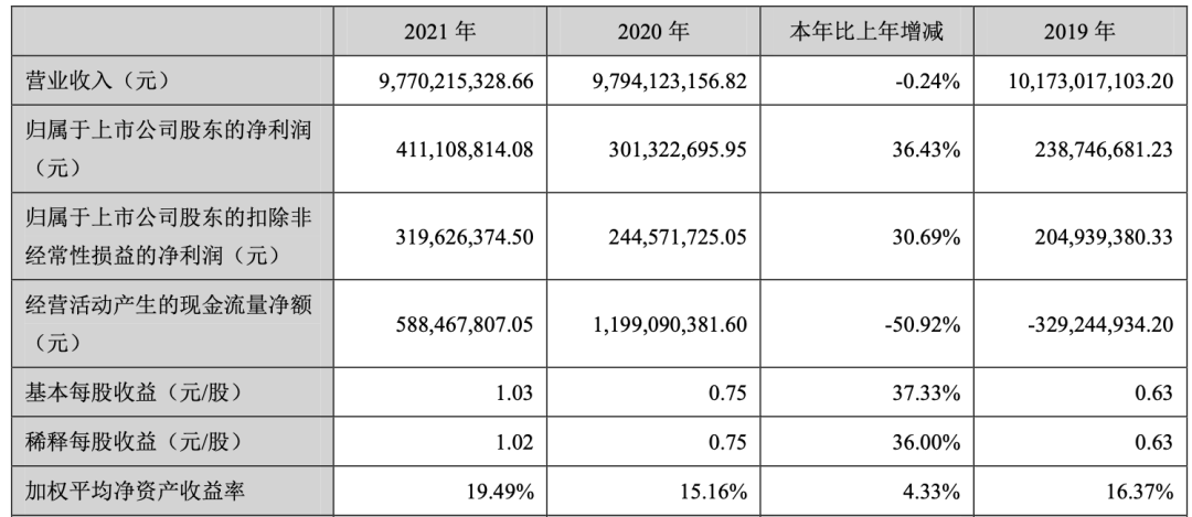 但是2022年一同發(fā)布的一季報中顯示,今年一季度,營收和凈利潤同比均出現(xiàn)較大幅度的下滑。其中,一季度營收30.89億元,同比下滑15.85%;凈利潤1.61億元,同比下滑48.75%;基本每股收益0.4元/股,同比下滑49.37%。