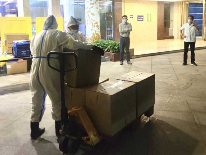 4月25日深夜,四輛來自蘇寧易購家樂福的物資運輸保供車輛抵達江蘇援滬醫(yī)療隊在南京的隔離酒店,車上裝載著2000余份為江蘇援滬醫(yī)療隊人員精心準備的“能量包”。