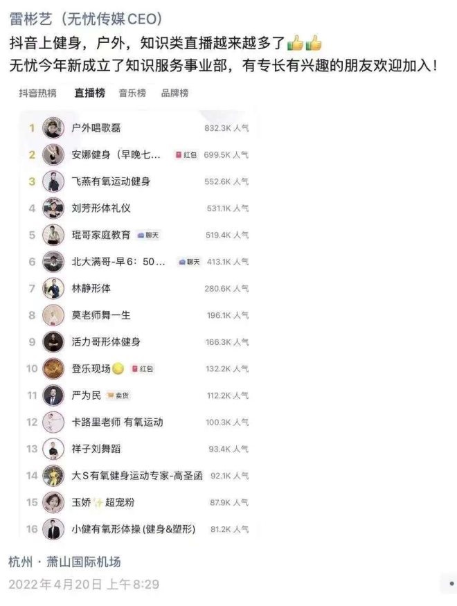 4月20日,雷彬藝曾在朋友圈透露,抖音上有關(guān)健身和戶外的知識(shí)類直播越來越多了,無憂傳媒在今年新成立了知識(shí)服務(wù)事業(yè)部。附圖中可以看到,抖音直播榜的前16名幾乎被健身相關(guān)博主屠榜。