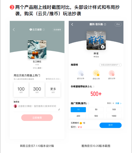 3. 酷狗音樂抄襲網(wǎng)易云音樂“云貝推歌”功能設定及界面設計